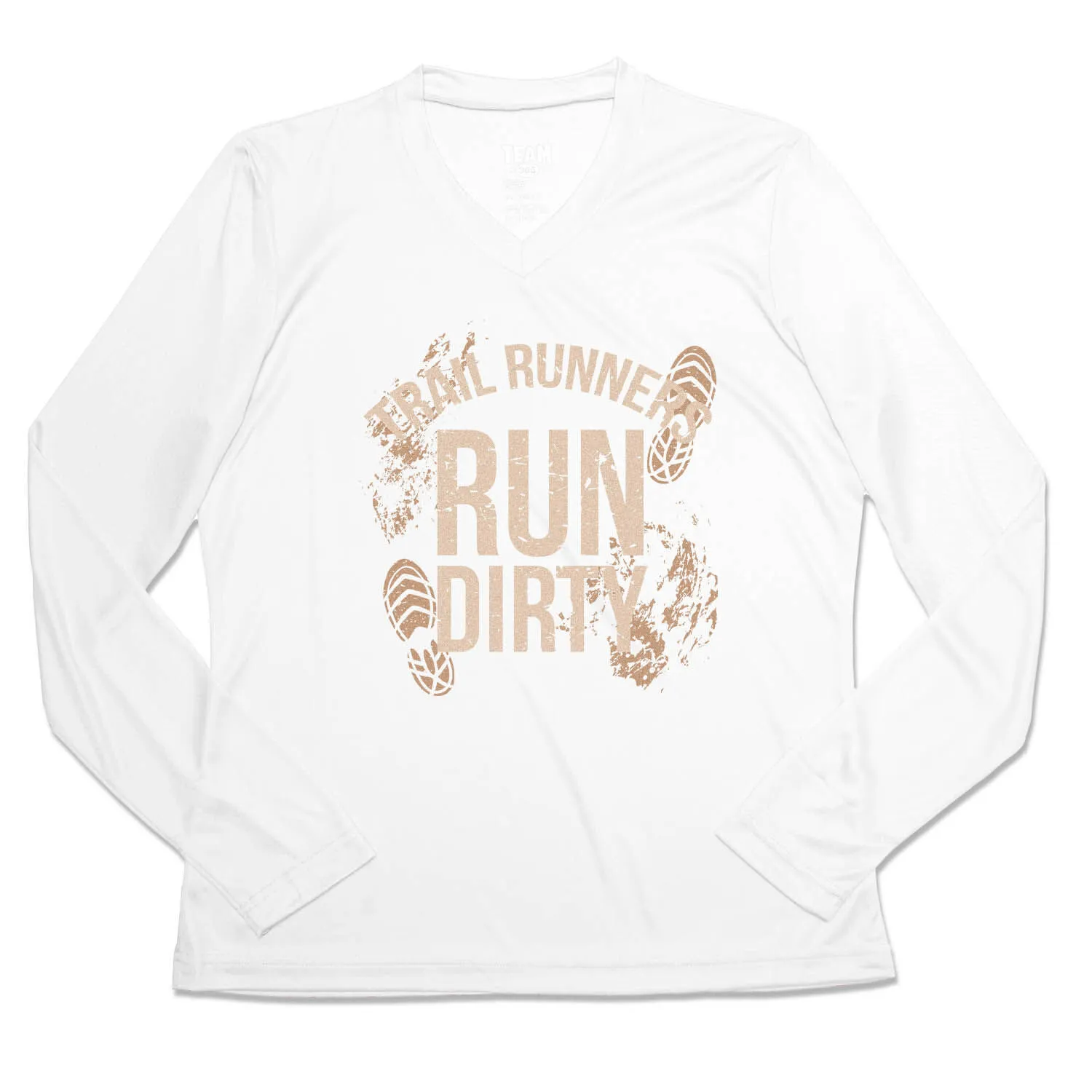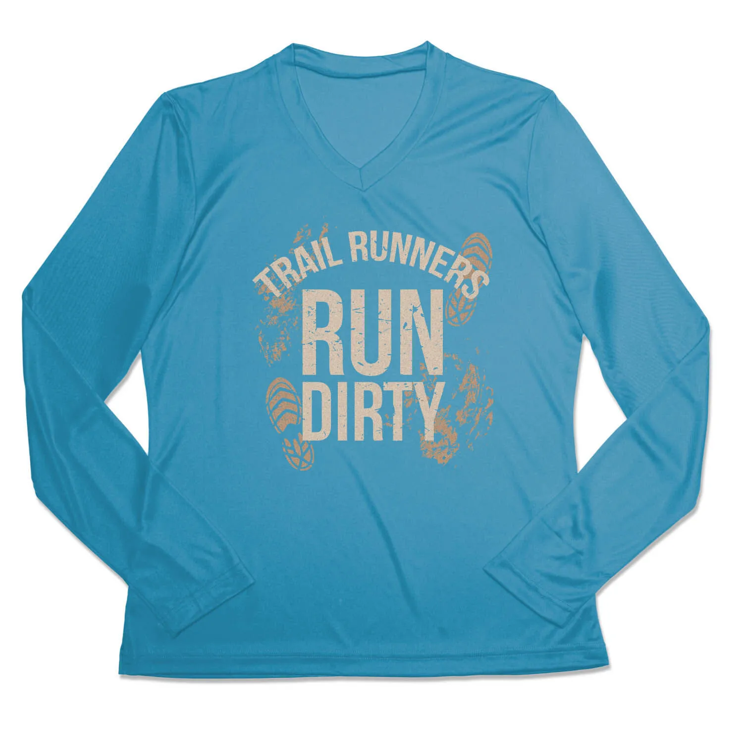 Run dirty through the trails in our women’s long sleeve tech tee. Our V-neck performance tee is made from 100% polyester interlock to keep runners dry and cool. The long sleeve tech tee offers a comfortable and relaxed fit that looks great with any choice of bottoms from leggings and athletic tights to jeans and longs. This stylish tech tee is perfect for everyday wear and an ideal running gift for any occasion. Any trail runner will rock this top.