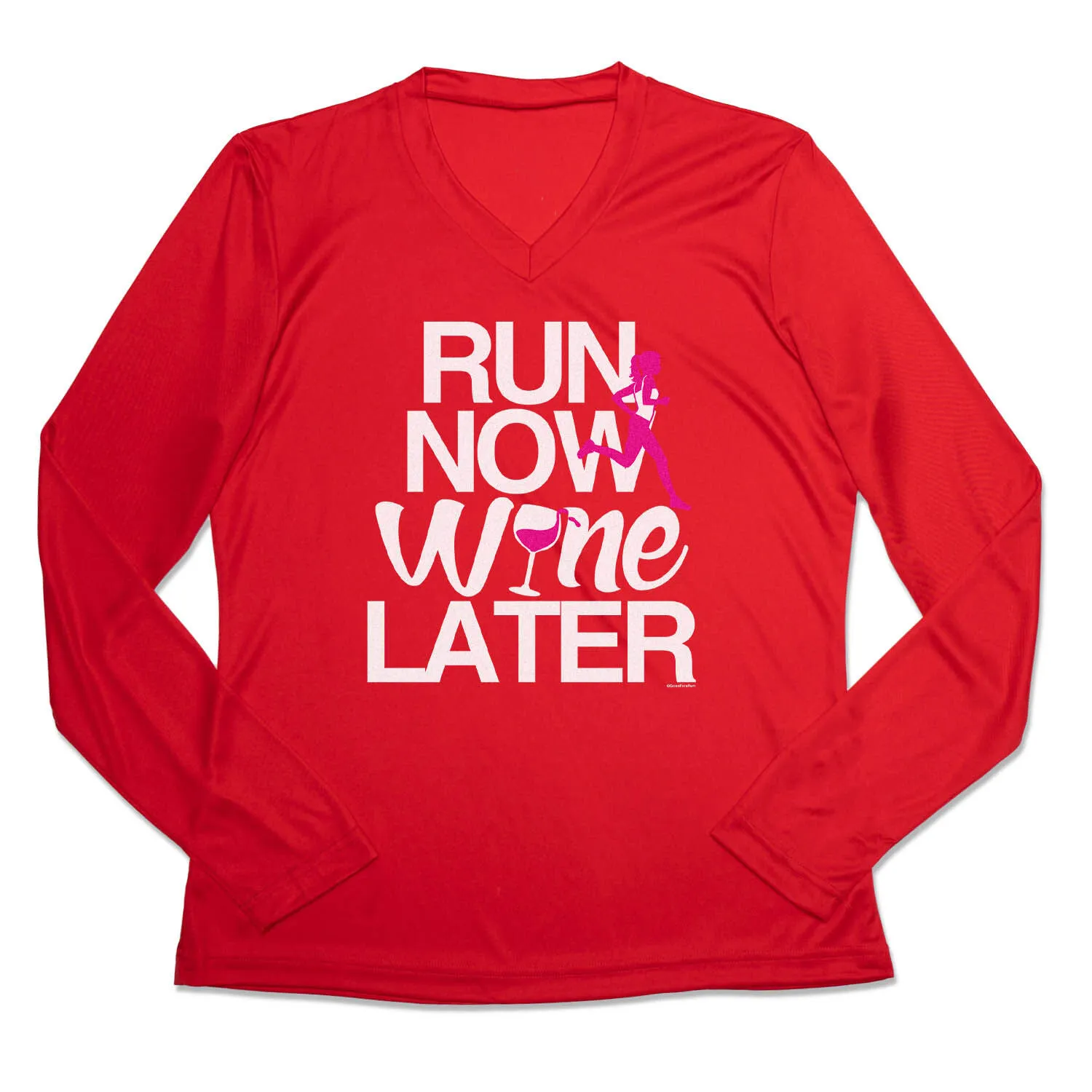 Women’s Long Sleeve Tech Tee – Run Now Wine Later (Bold)