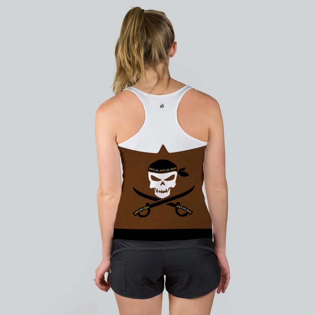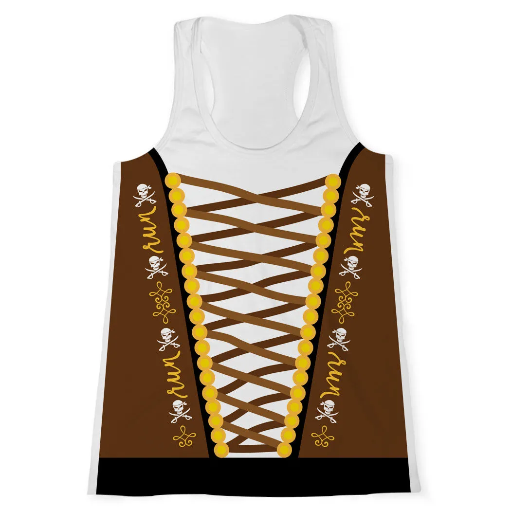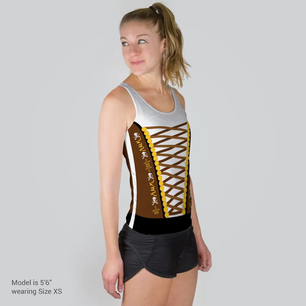 Be a true buccaneer when running a race, or any time, in our eye-catching women’s performance running singlet with a faux corset and vest for a bold look – as well as a stylized pirate skull and crossbones on back. The moisture-wicking, 100% polyester microfiber material is designed to keep runners cool and dry when running even the most strenuous races and will be a favorite when dressing up for a special race – or even for everyday runs. The unique look of this racerback singlet is sure to ensure a runner will stand out in a crowd, and is an excellent running gift to surprise a runner prior to a special race they have been looking forward to.