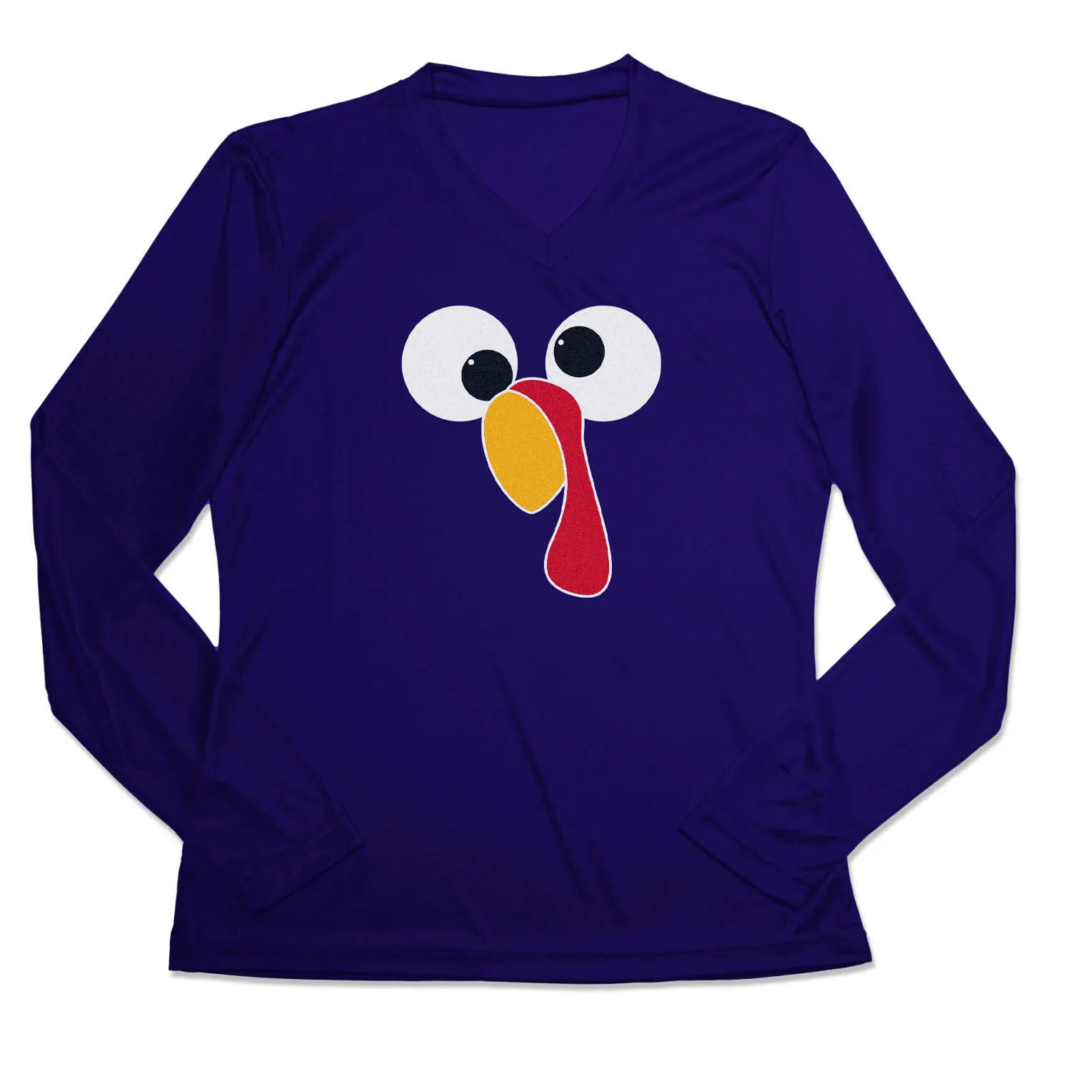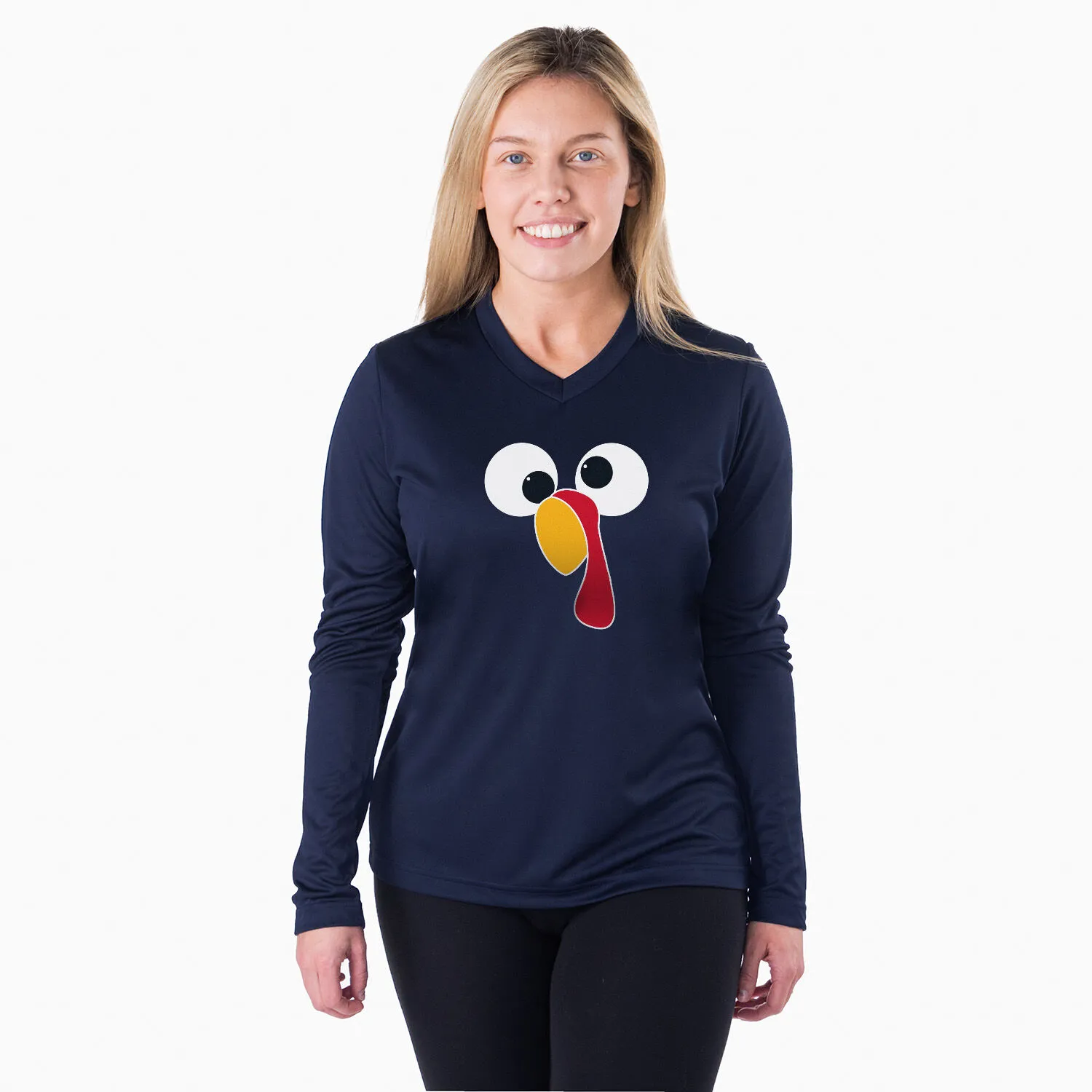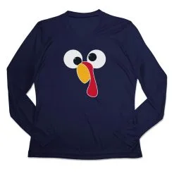 Get in the holiday spirit in our women’s long sleeve tech tee featuring a one-of-a-kind Thanksgiving design inspired by running. Our V-neck performance tee is made from 100% polyester interlock to keep runners dry and cool. The long sleeve tech tee offers a comfortable and relaxed fit that looks great with any choice of bottoms from leggings and athletic tights to jeans and longs. This stylish tech tee is perfect for everyday wear and an ideal running gift for any occasion. Any runner would love this for any turkey race.