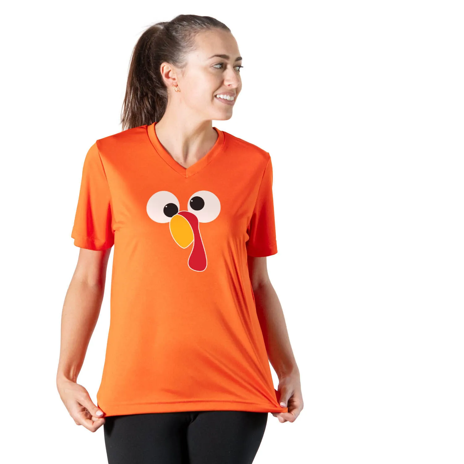 Get in the holiday spirit in our women’s short sleeve tech tee featuring a one-of-a-kind Thanksgiving design inspired by running. Our V-neck performance tee is made from 100% polyester interlock to keep runners dry and cool. The short sleeve tech tee offers a comfortable and relaxed fit that looks great with any choice of bottoms from leggings and athletic tights to jeans and shorts. This stylish tech tee is perfect for everyday wear and an ideal running gift for any occasion. Any runner would love this for any turkey race.