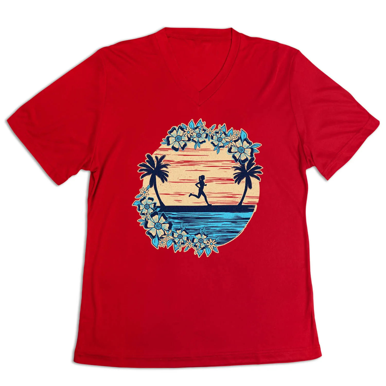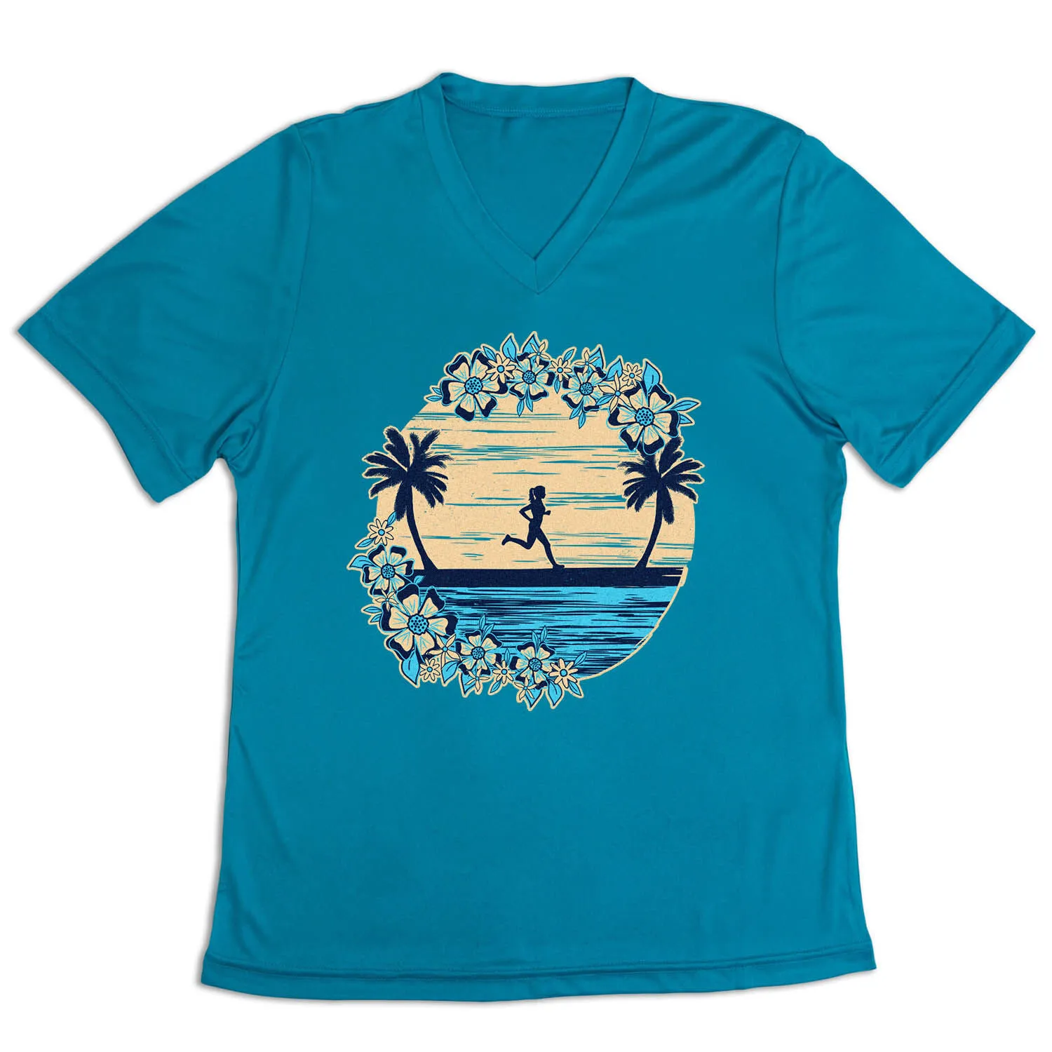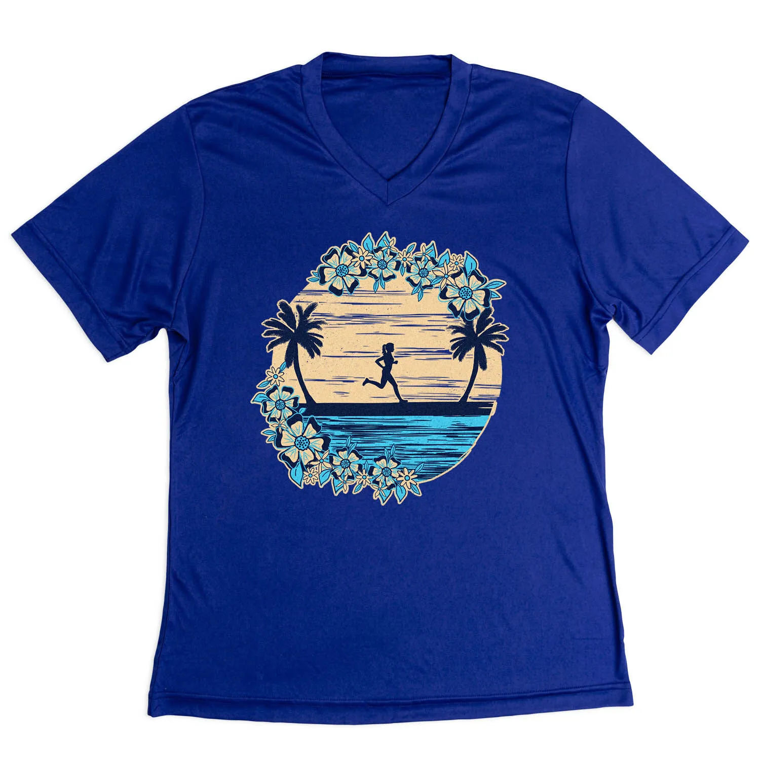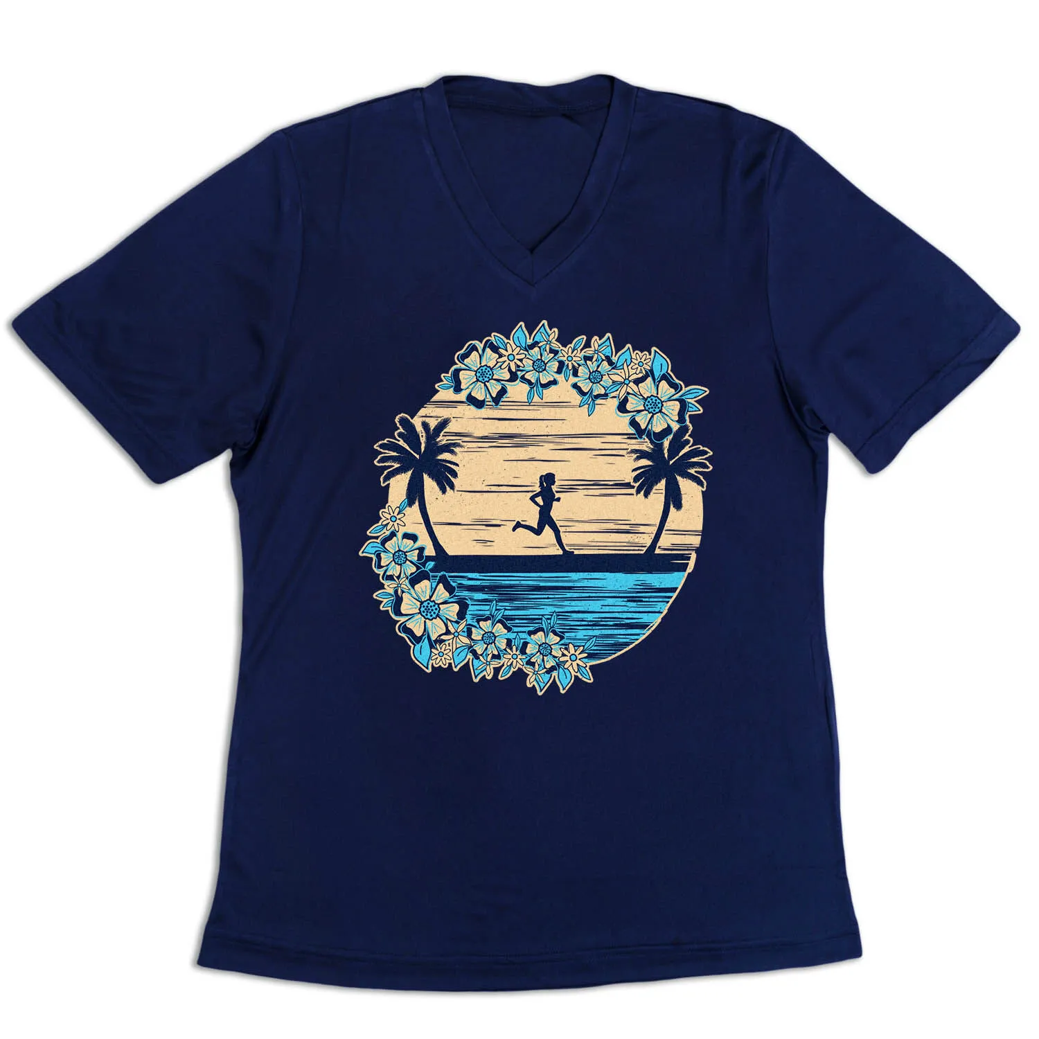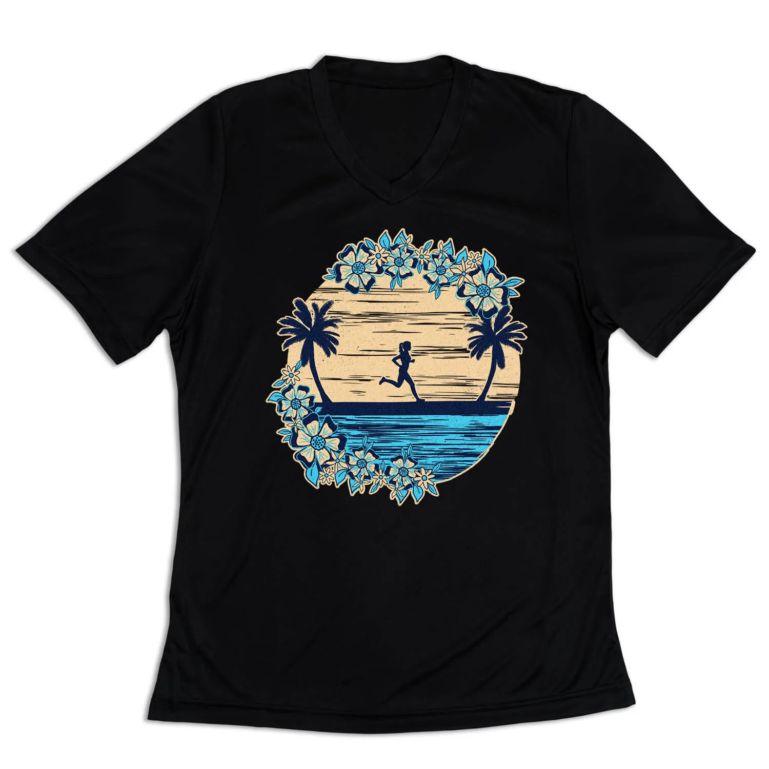 Show off your runner girl pride in our women’s short sleeve tech tee featuring a one-of-a-kind Beach Runner Girl design. Our V-neck performance tee is made from 100% polyester interlock to keep runners dry and cool. The short sleeve tech tee offers a comfortable and relaxed fit that looks great with any choice of bottoms from leggings and athletic tights to jeans and shorts. This stylish tech tee is perfect for everyday wear and an ideal running gift for any occasion. Enjoy your beach runs in the most comfortable athletic tee for runners.