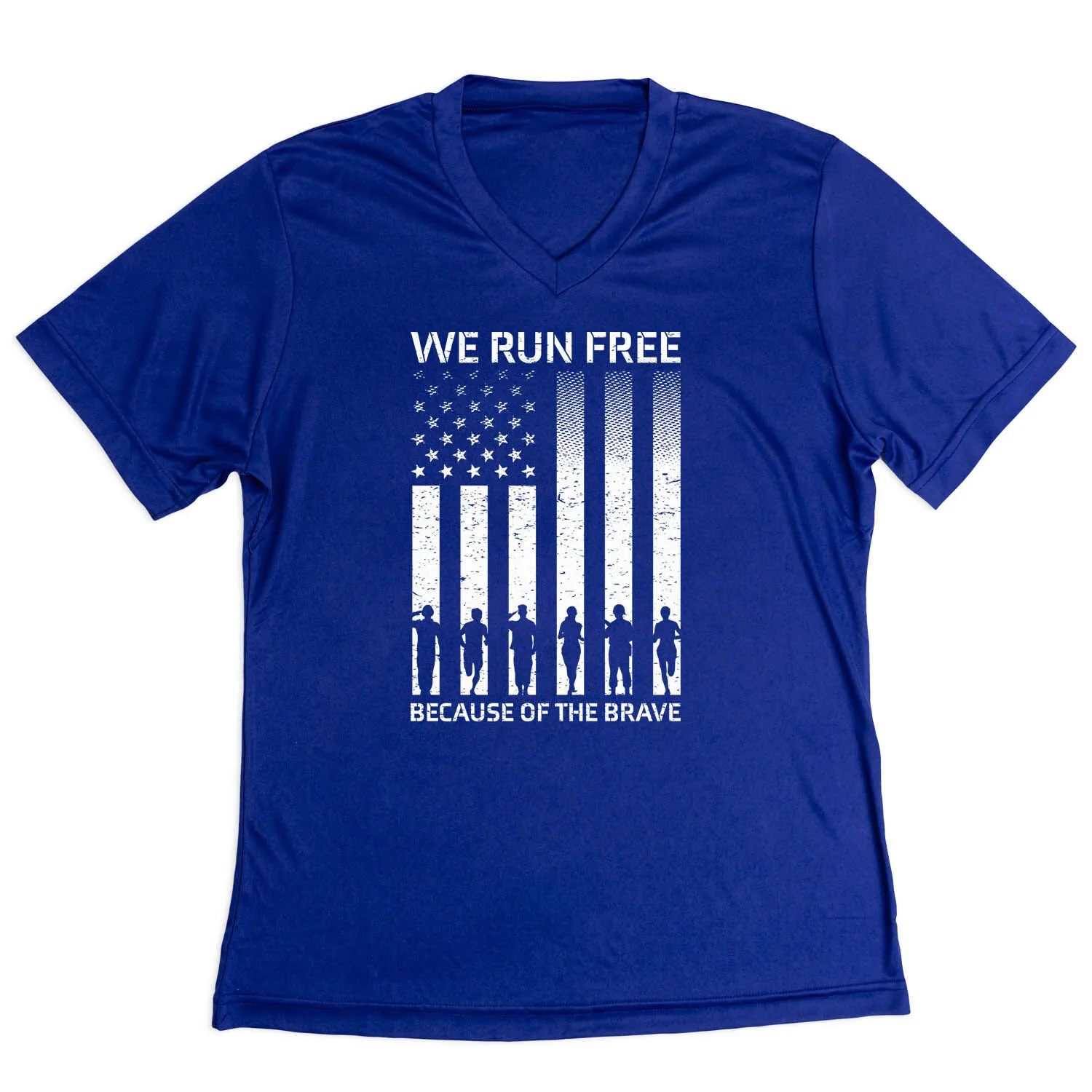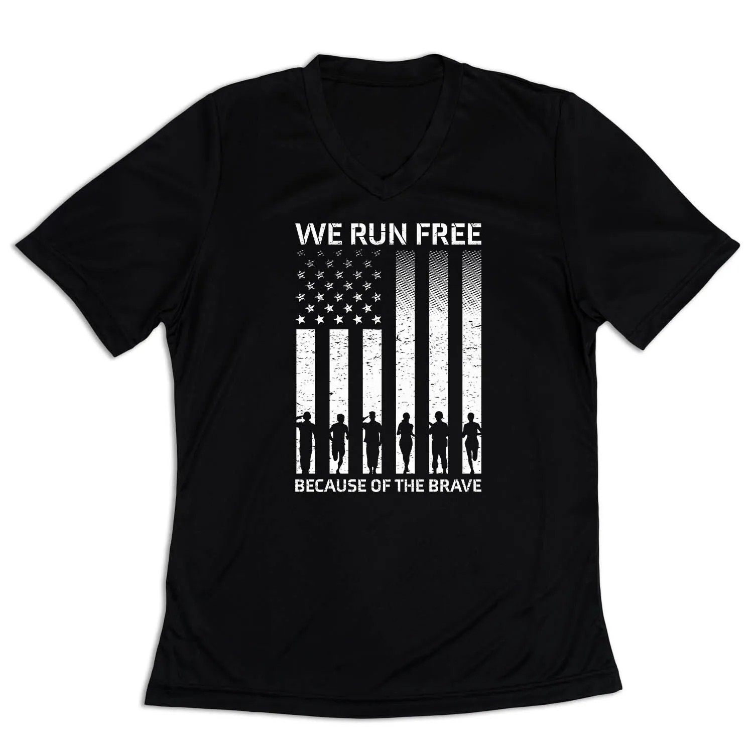 Show off your USA pride with our Because of the Brave women’s short sleeve tech tee. Featuring a patriotic design, this V-neck performance tee is made from 100% polyester interlock, which ensures runners stay dry and cool even during the toughest workouts. The short sleeve tech tee offers a comfortable and relaxed fit that looks great with any choice of bottoms, from leggings and athletic tights to jeans and shorts. This stylish tech tee is not only perfect for everyday wear, but also for patriotic races and occasions like Memorial Day or the 4th of July. It’s an ideal gift for any runner girl who loves to represent her country and passion for running.