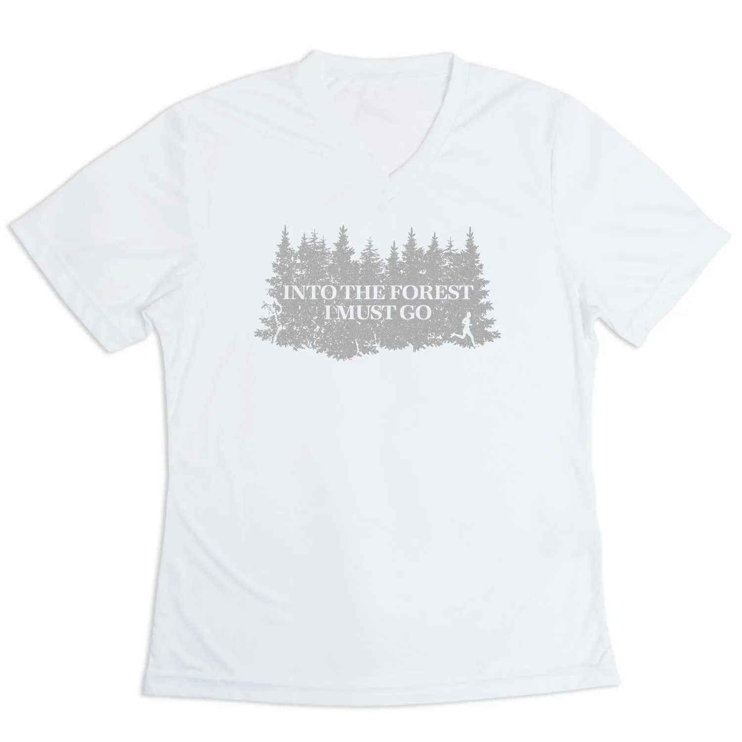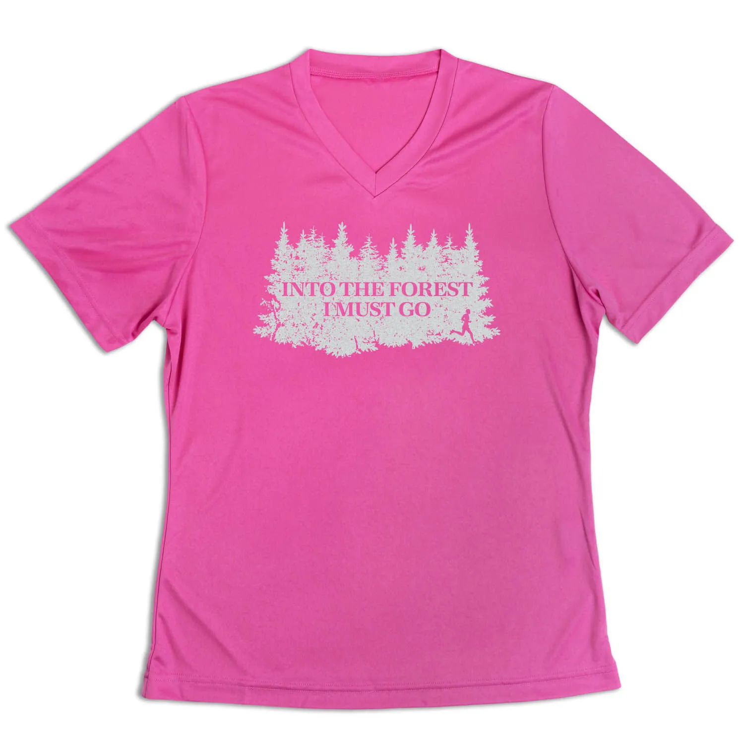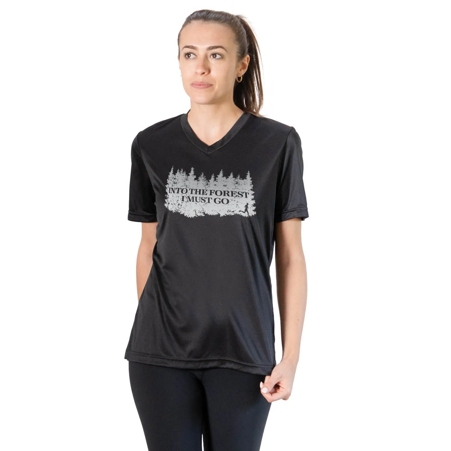 Show off your runner pride in our women’s short sleeve tech tee featuring our exclusive Into the Forest I Must Go Running design. Our V-neck performance tee is made from 100% polyester interlock to keep runners dry and cool. The short sleeve tech tee offers a comfortable and relaxed fit that looks great with any choice of bottoms from leggings and athletic tights to jeans and shorts. This stylish tech tee is perfect for everyday wear and an ideal running gift for any occasion.