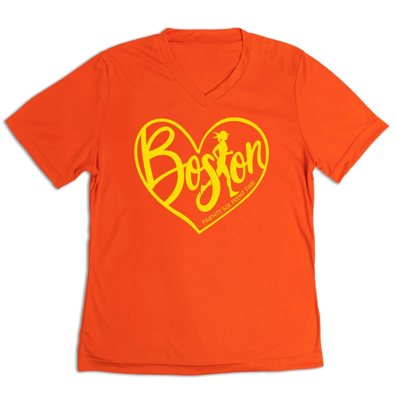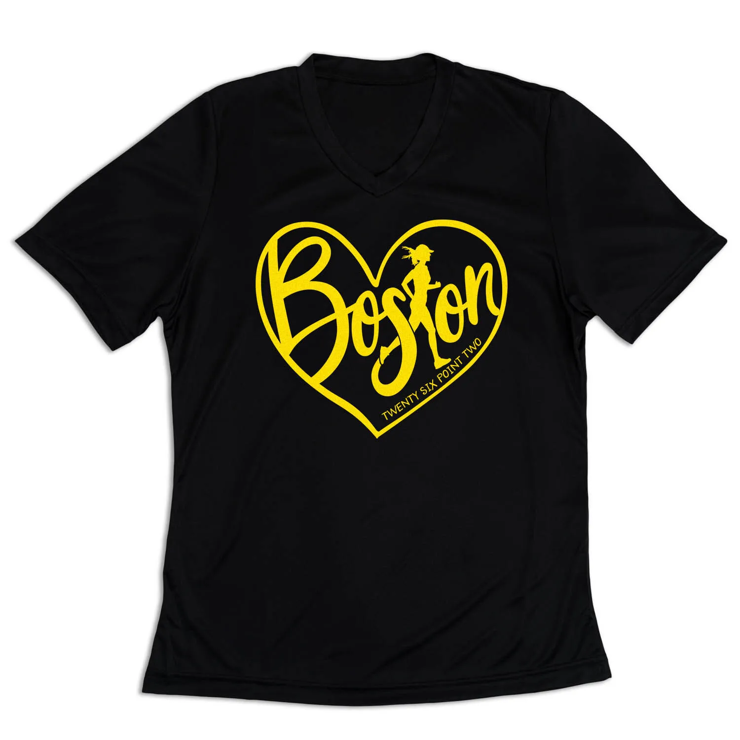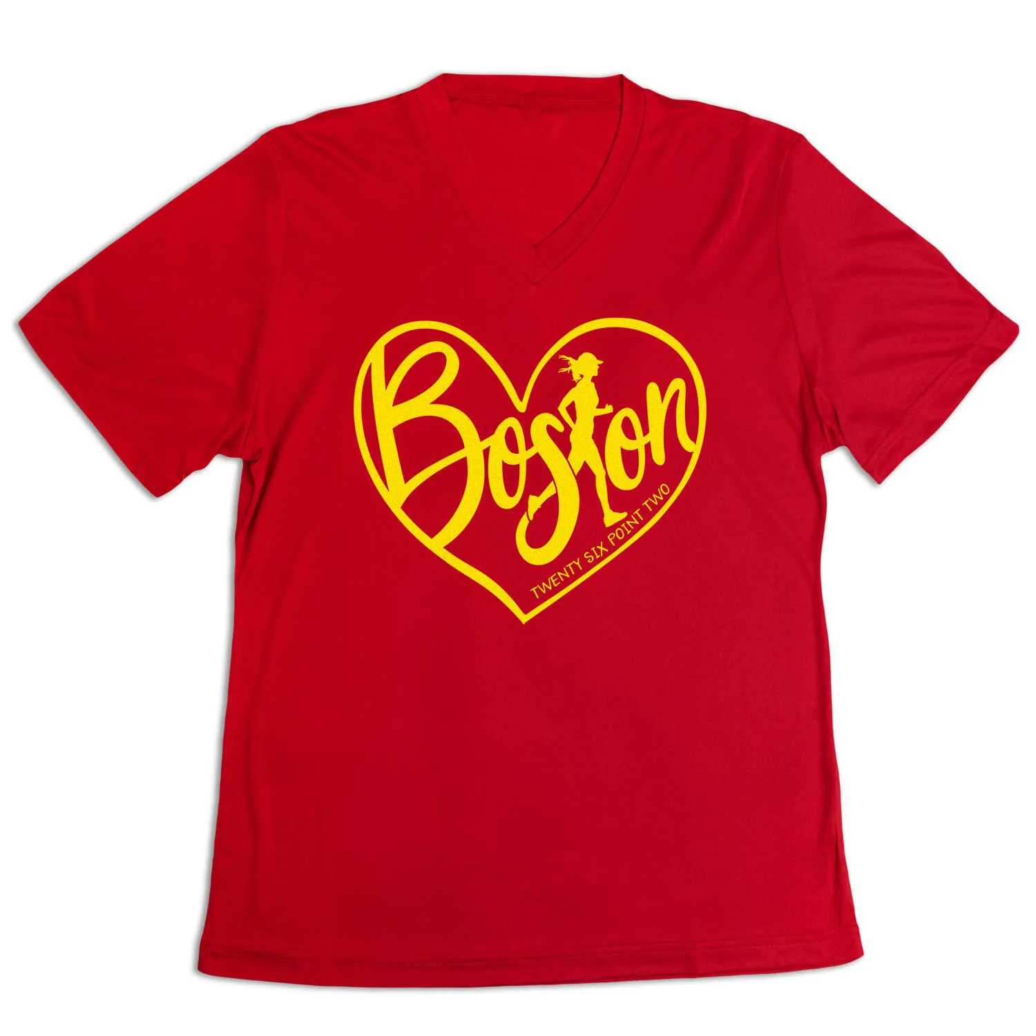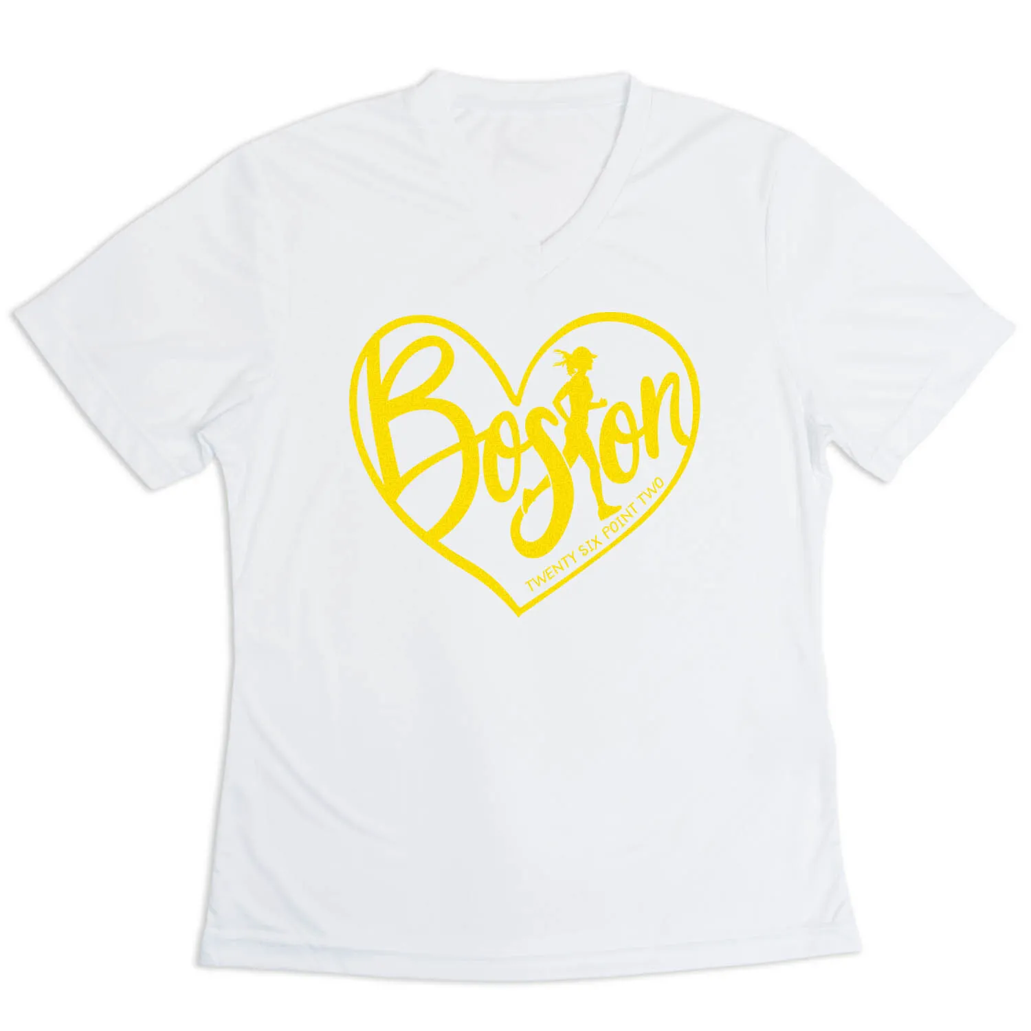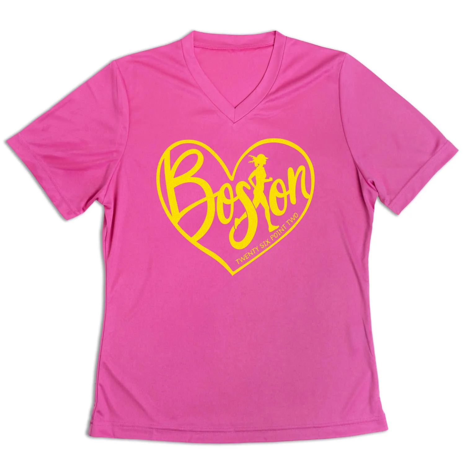 Show off your running pride in our women’s short sleeve tech tee featuring a one-of-a-kind bold design inspired by running. Our V-neck performance tee is made from 100% polyester interlock to keep runners dry and cool. The short sleeve tech tee offers a comfortable and relaxed fit that looks great with any choice of bottoms from leggings and athletic tights to jeans and shorts. This stylish tech tee is perfect for everyday wear and an ideal running gift for any occasion.