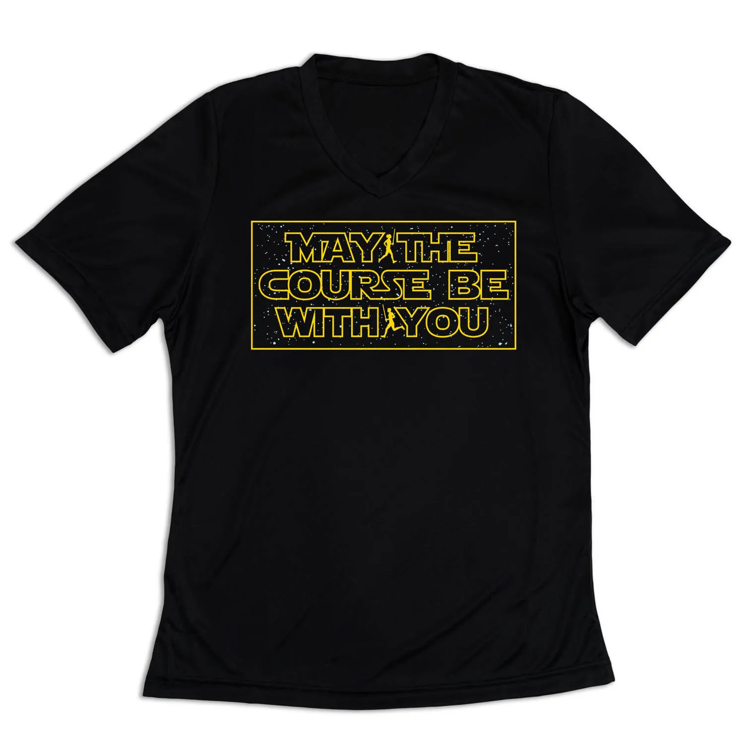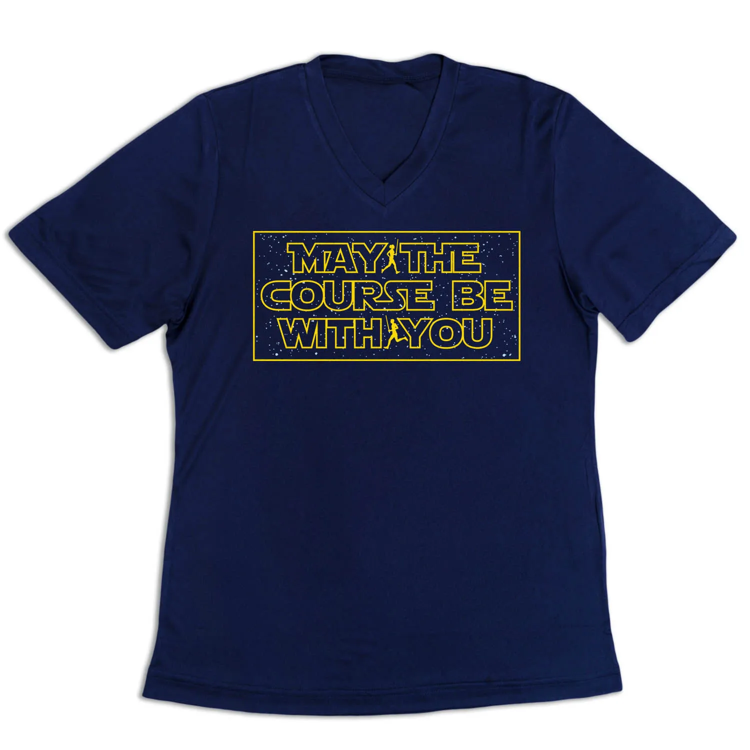 May the Course Be with You in our women’s short sleeve tech tee featuring an exclusive running design. Our V-neck performance tee is made from 100% polyester interlock to keep runners dry and cool. The short sleeve tech tee offers a comfortable and relaxed fit that looks great with any choice of bottoms from leggings and athletic tights to jeans and shorts. This stylish tech tee is perfect for magical races, everyday wear, and an ideal running gift for any occasion.