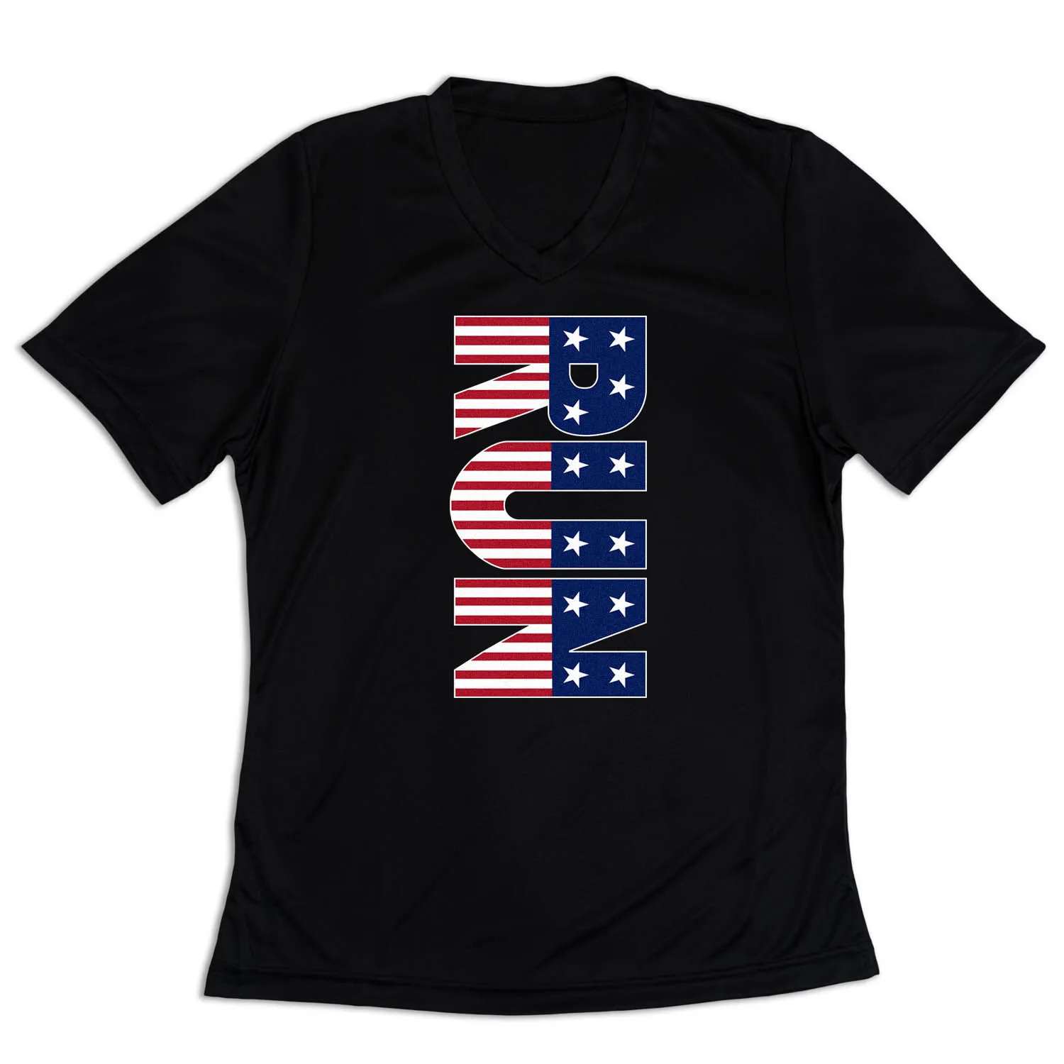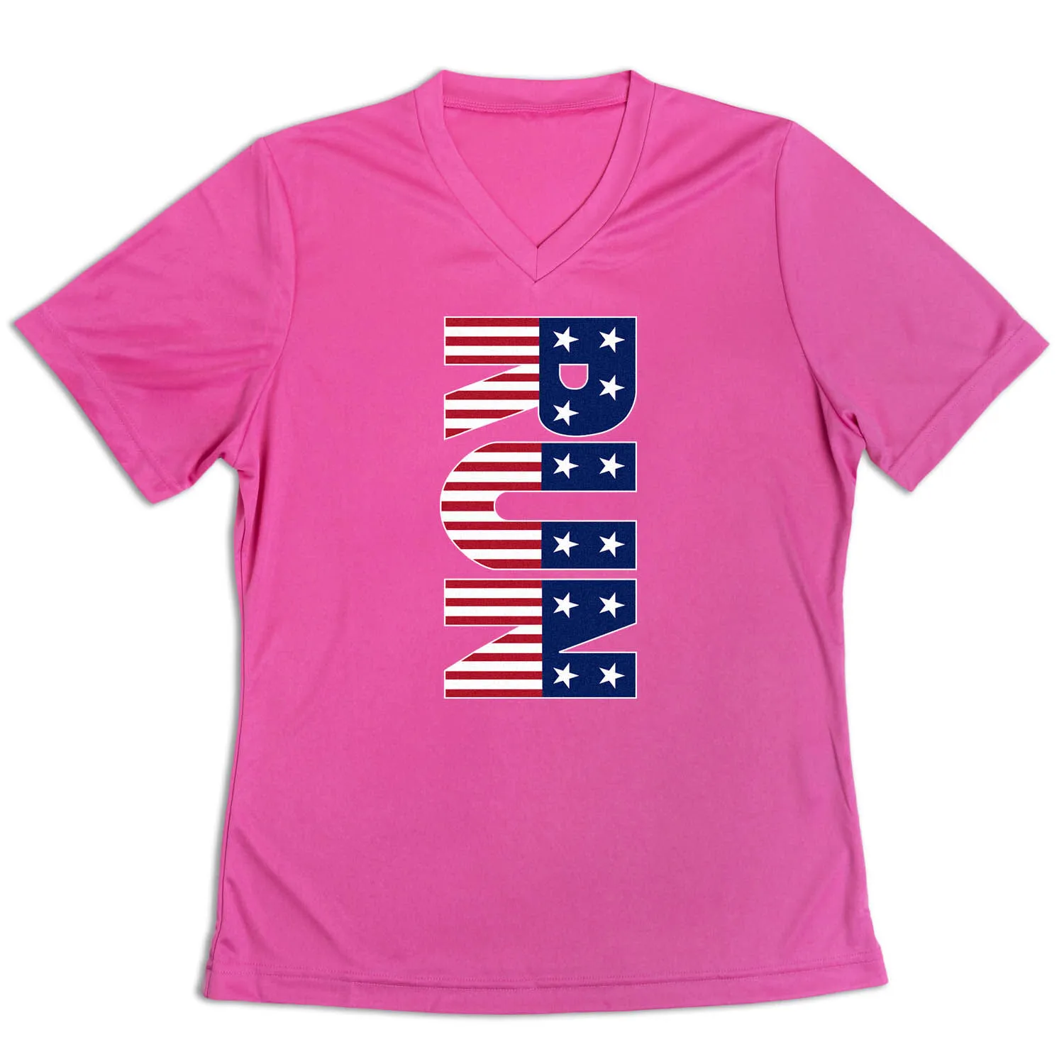 Show off your running pride in our women’s short sleeve tech tee featuring a one-of-a-kind bold design inspired by running. Our V-neck performance tee is made from 100% polyester interlock to keep runners dry and cool. The short sleeve tech tee offers a comfortable and relaxed fit that looks great with any choice of bottoms from leggings and athletic tights to jeans and shorts. This stylish tech tee is perfect for everyday wear and an ideal running gift for any occasion.