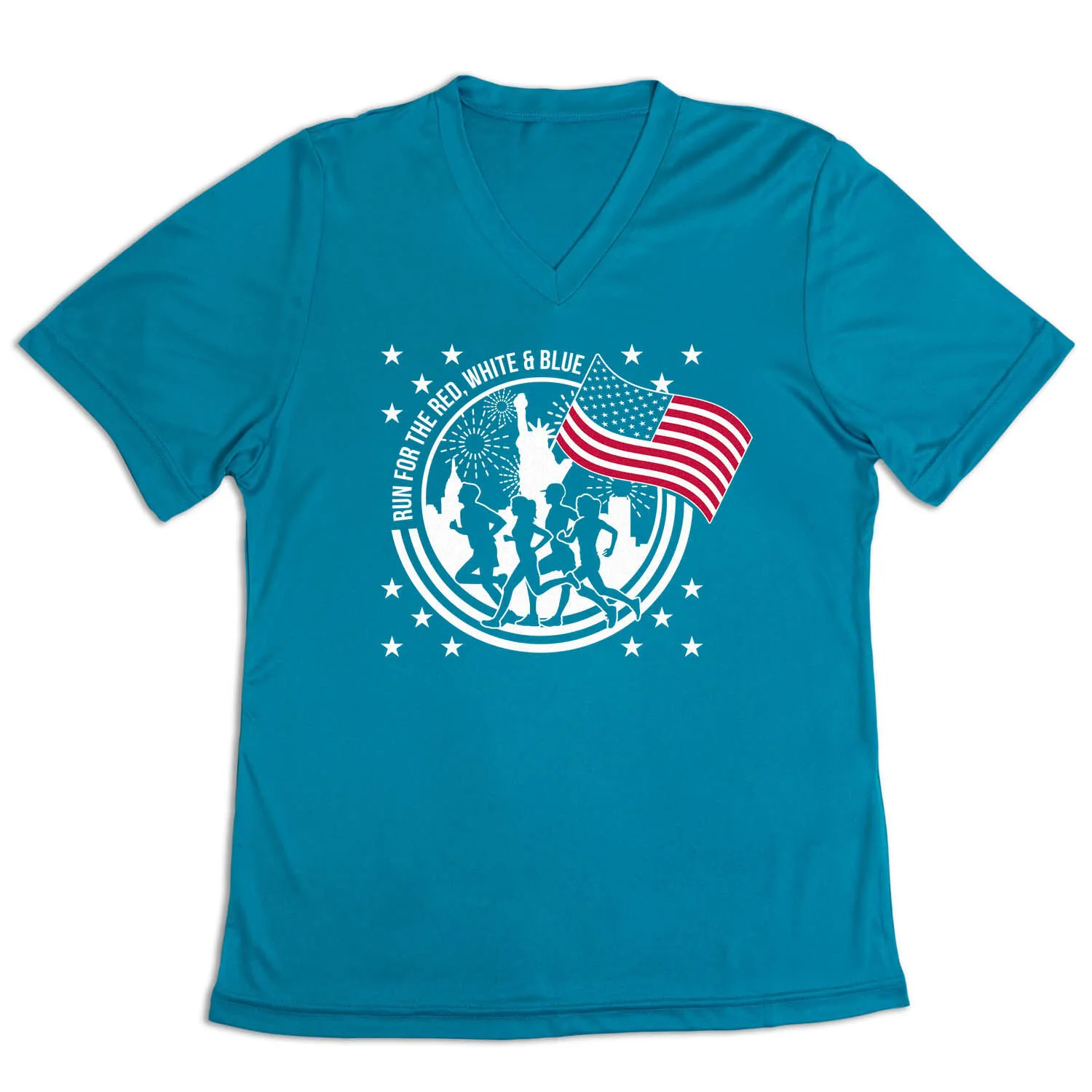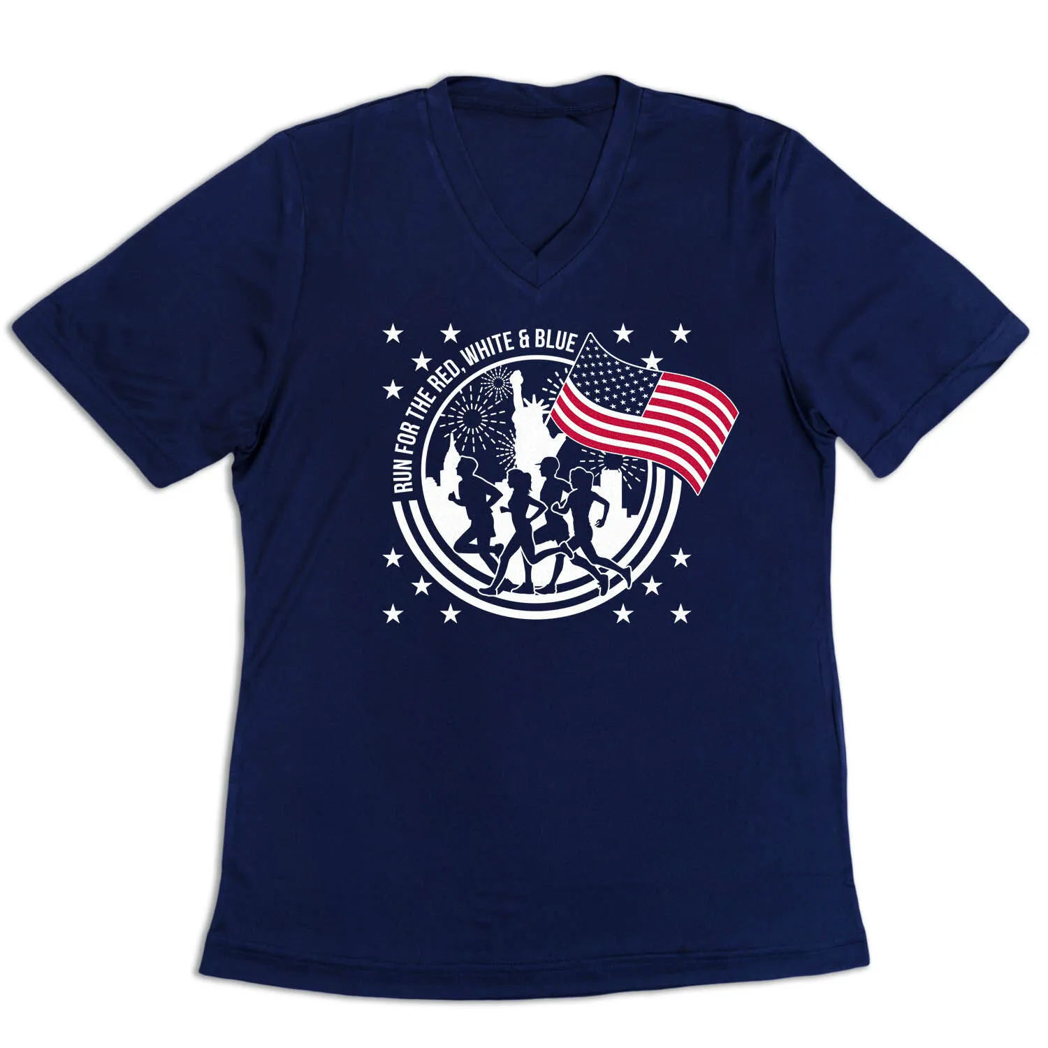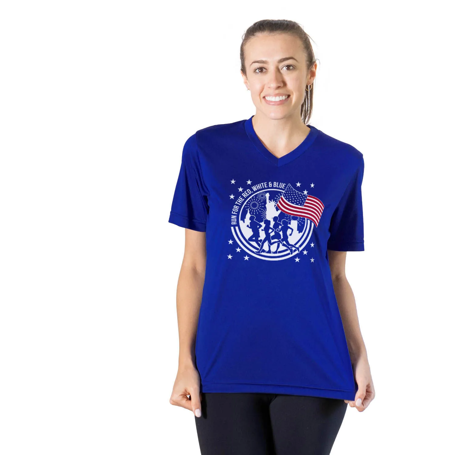 Display your pride for the USA with our Run for the Red, White & Blue women’s short sleeve tech tee. With a patriotic design, this V-neck performance tee is made of 100% polyester interlock to keep runners dry and cool even during their most challenging workouts. The tee offers a comfortable and relaxed fit that can be easily paired with any choice of bottoms, whether it’s leggings, athletic tights, jeans, or shorts. This stylish tech tee is perfect for any occasion, whether it’s for everyday wear or patriotic races and events like Memorial Day or the 4th of July. It’s also an excellent gift idea for any runner girl who wants to show her country and passion for running.