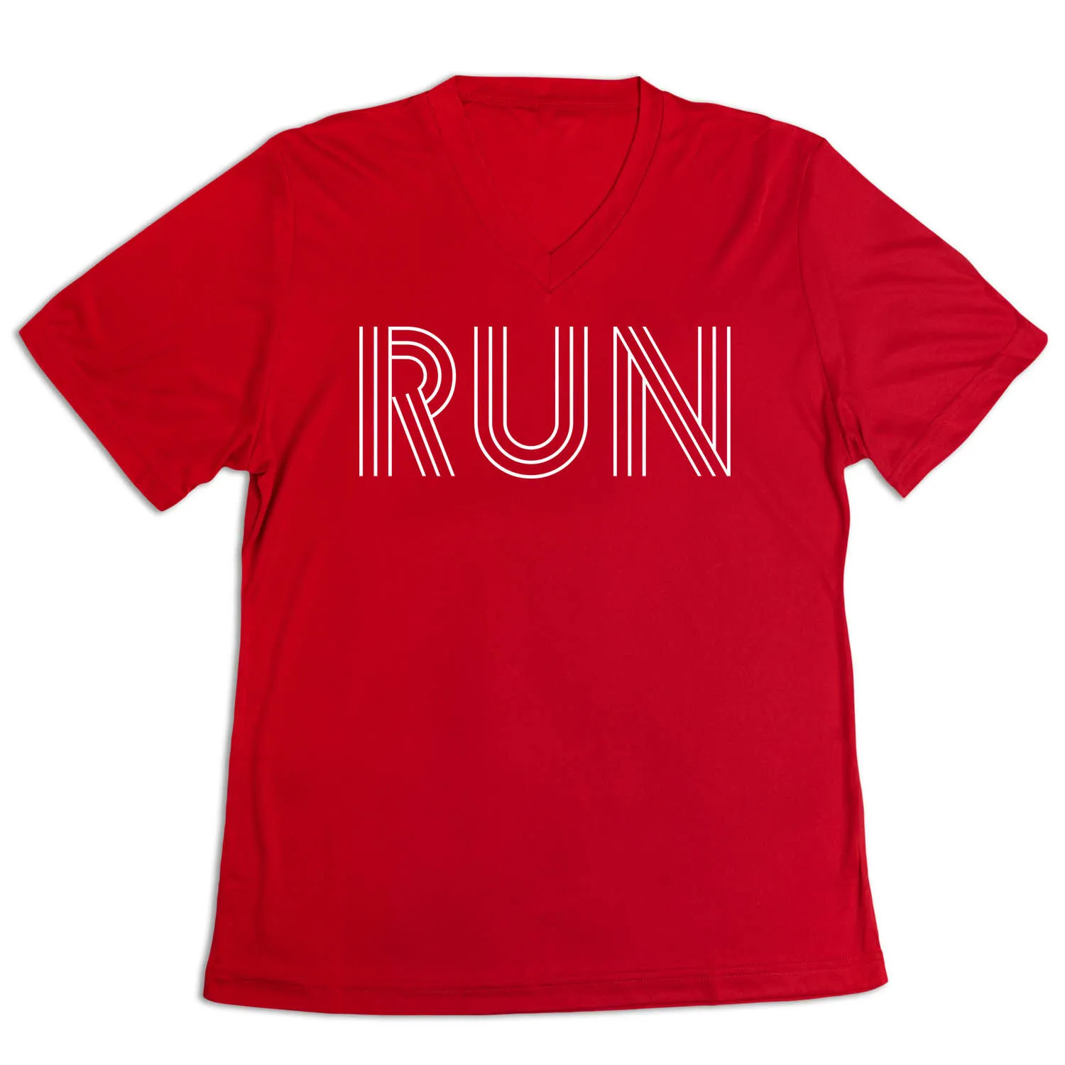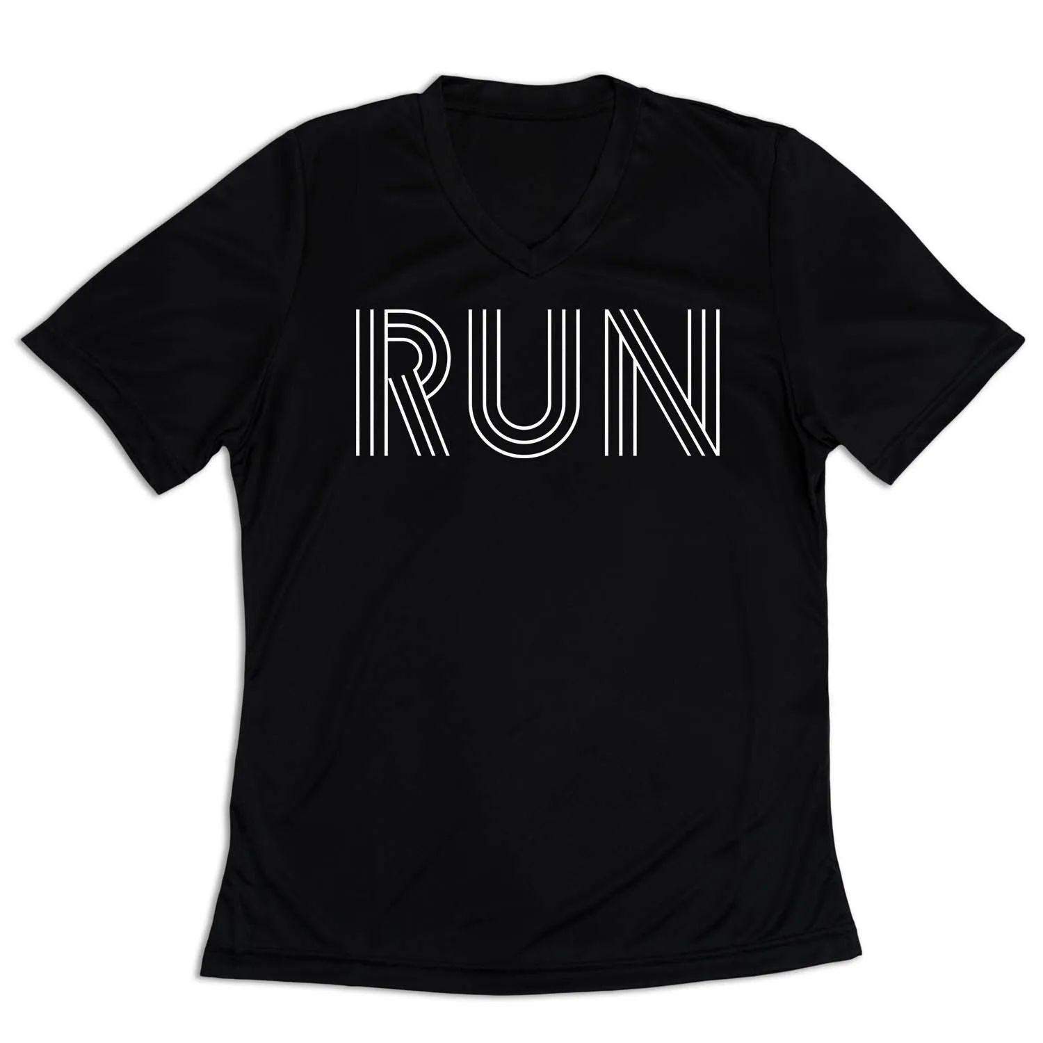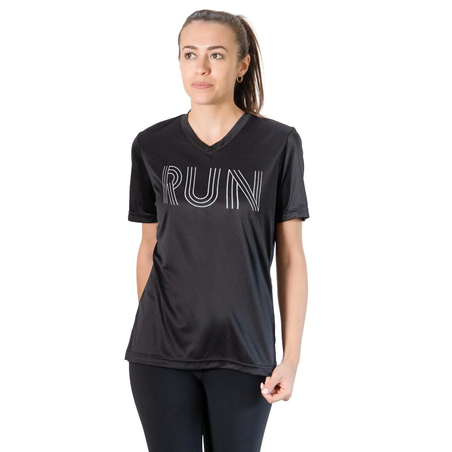 Show off your running pride in our women’s short sleeve tech tee featuring a one-of-a-kind bold design inspired by running. Our V-neck performance tee is made from 100% polyester interlock to keep runners dry and cool. The short sleeve tech tee offers a comfortable and relaxed fit that looks great with any choice of bottoms from leggings and athletic tights to jeans and shorts. This stylish tech tee is perfect for everyday wear and an ideal running gift for any occasion.