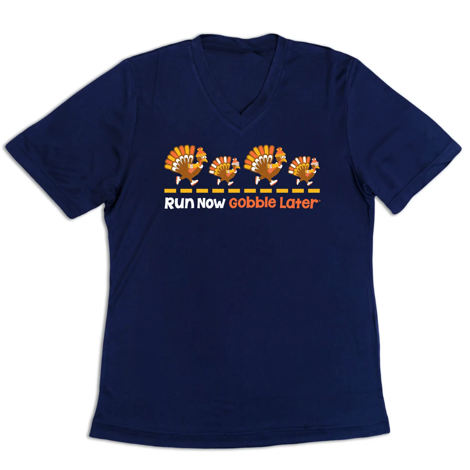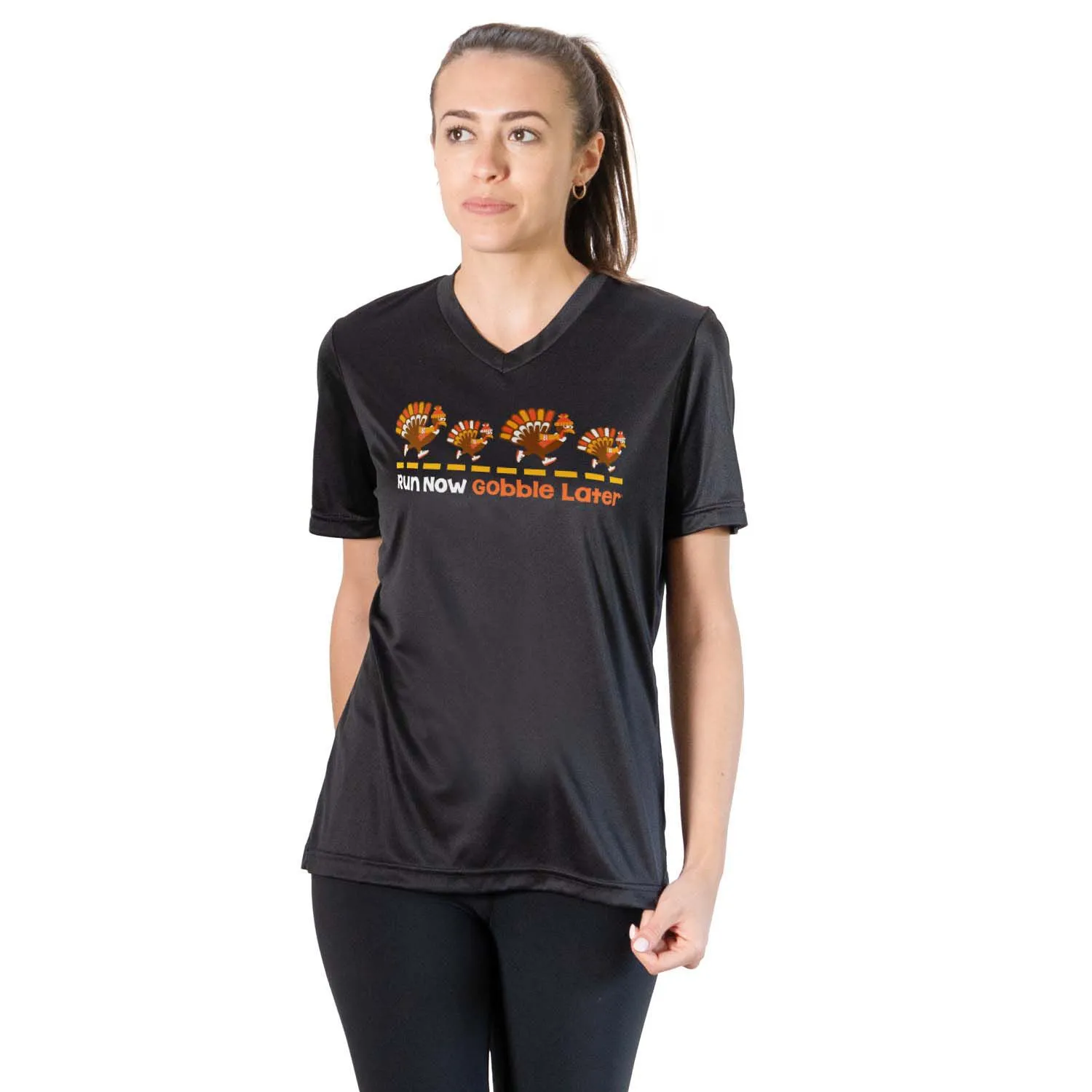 Get in the holiday spirit in our women’s short sleeve tech tee featuring a one-of-a-kind Thanksgiving design inspired by running. Our V-neck performance tee is made from 100% polyester interlock to keep runners dry and cool. The short sleeve tech tee offers a comfortable and relaxed fit that looks great with any choice of bottoms from leggings and athletic tights to jeans and shorts. This stylish tech tee is perfect for everyday wear and an ideal running gift for any occasion. Any runner would love this for any turkey race.