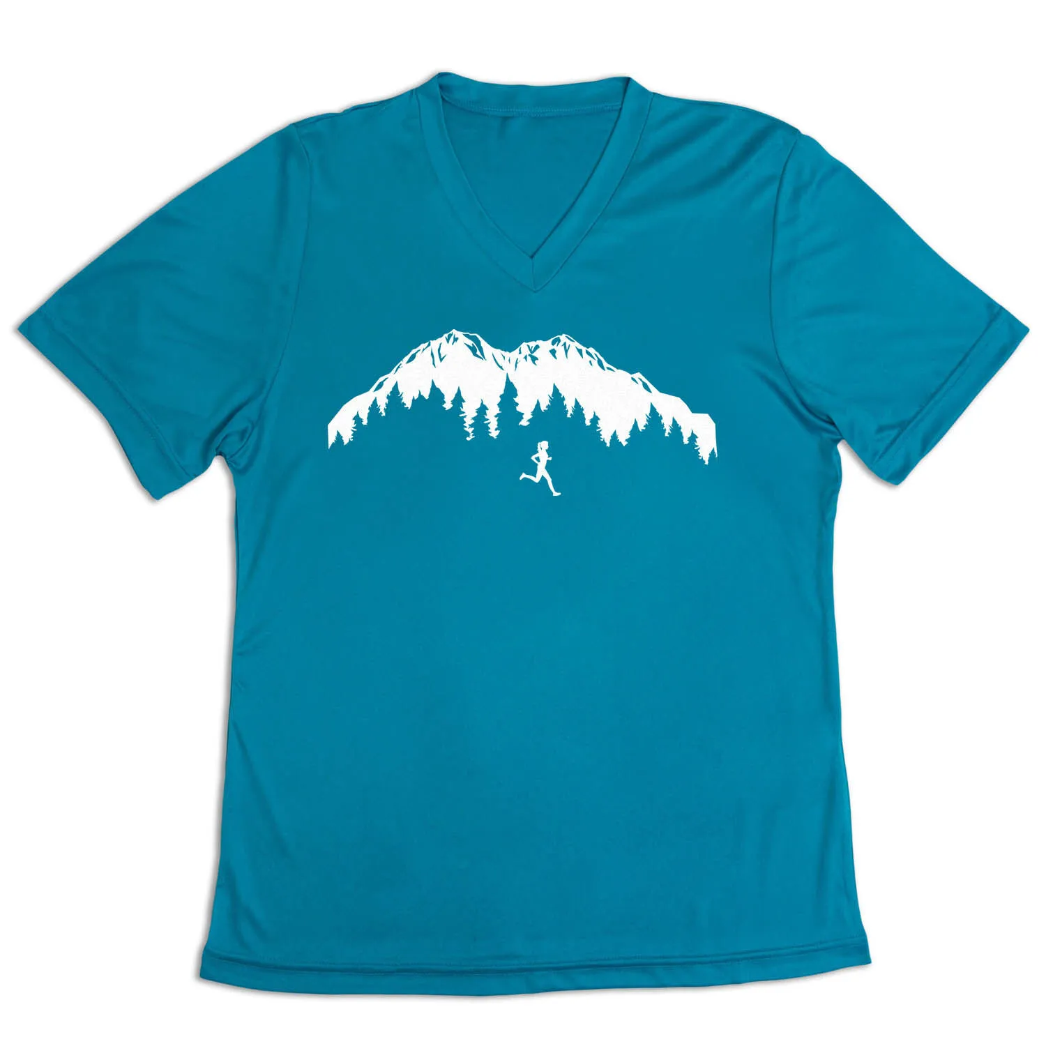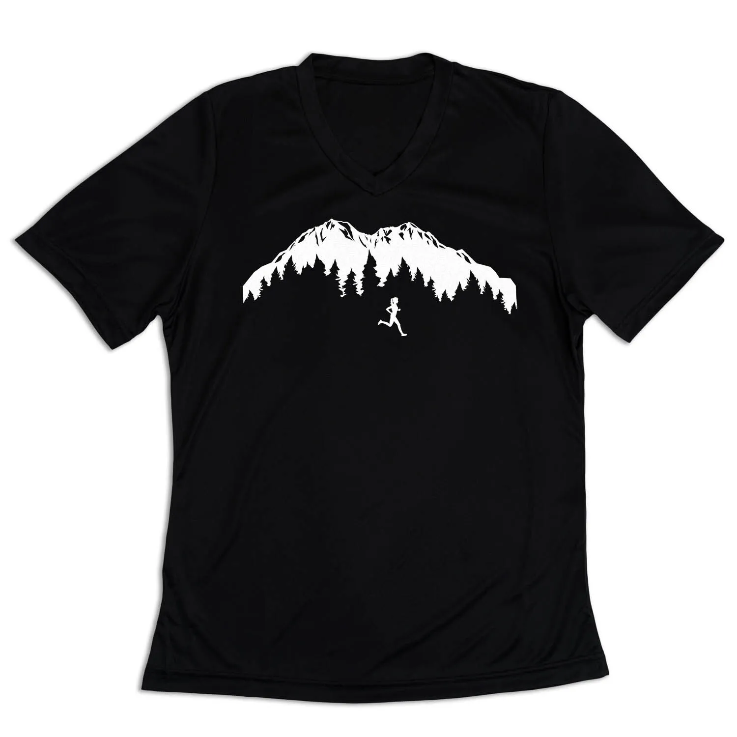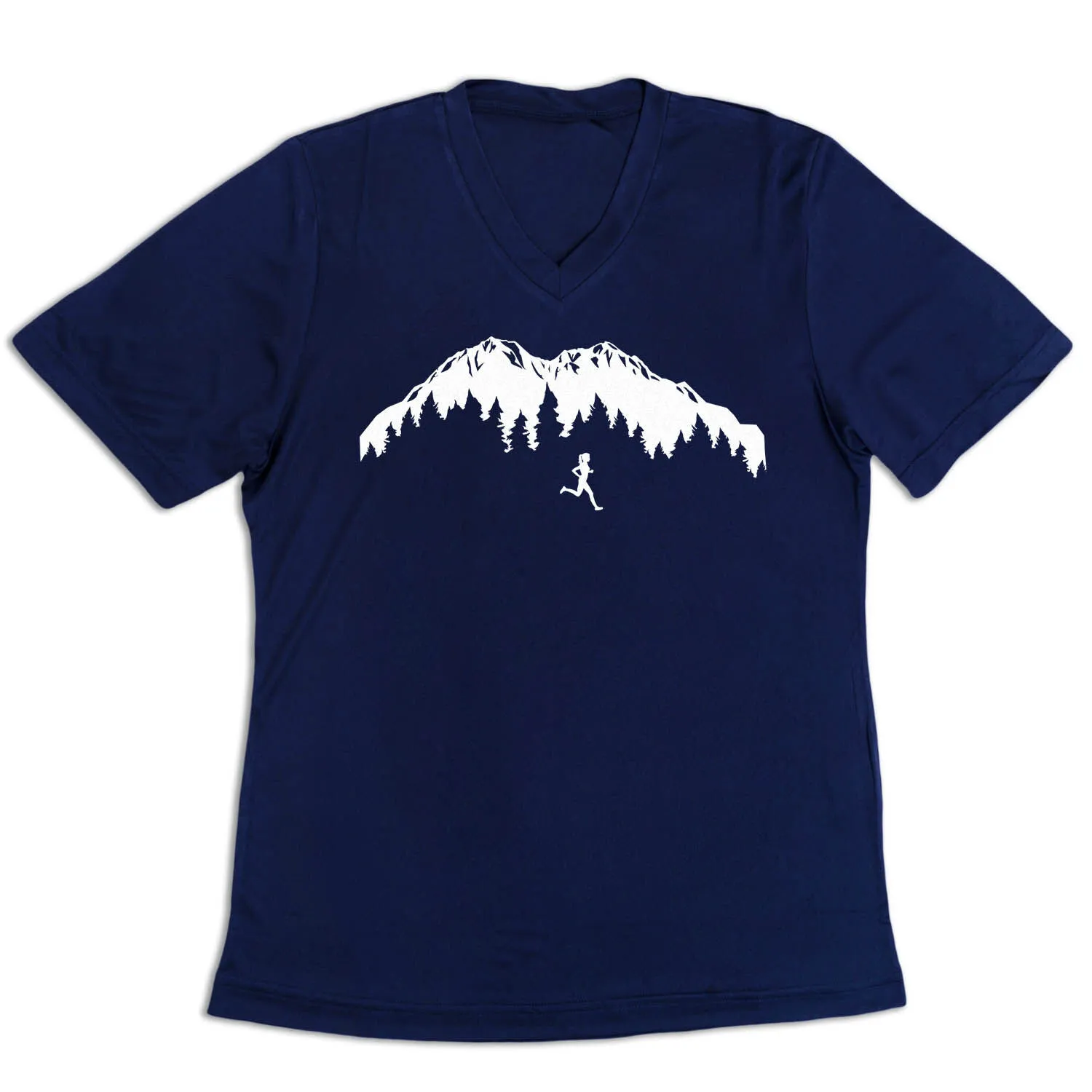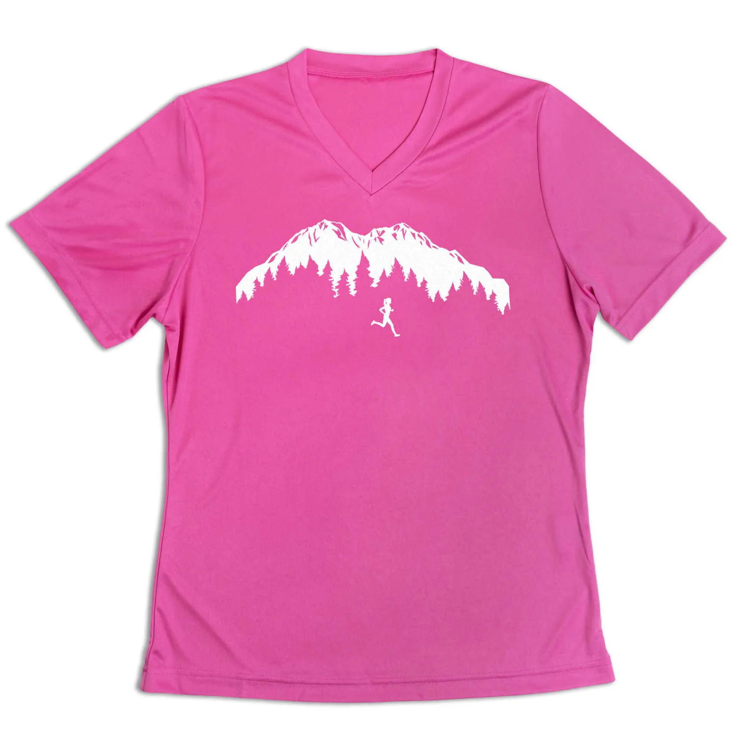 Show off your trail runner pride in our women’s short sleeve tech tee featuring our exclusive Trail Runner in the Mountains design. Our V-neck performance tee is made from 100% polyester interlock to keep runners dry and cool. The short sleeve tech tee offers a comfortable and relaxed fit that looks great with any choice of bottoms from leggings and athletic tights to jeans and shorts. This stylish tech tee is perfect for everyday wear and an ideal running gift for any occasion.